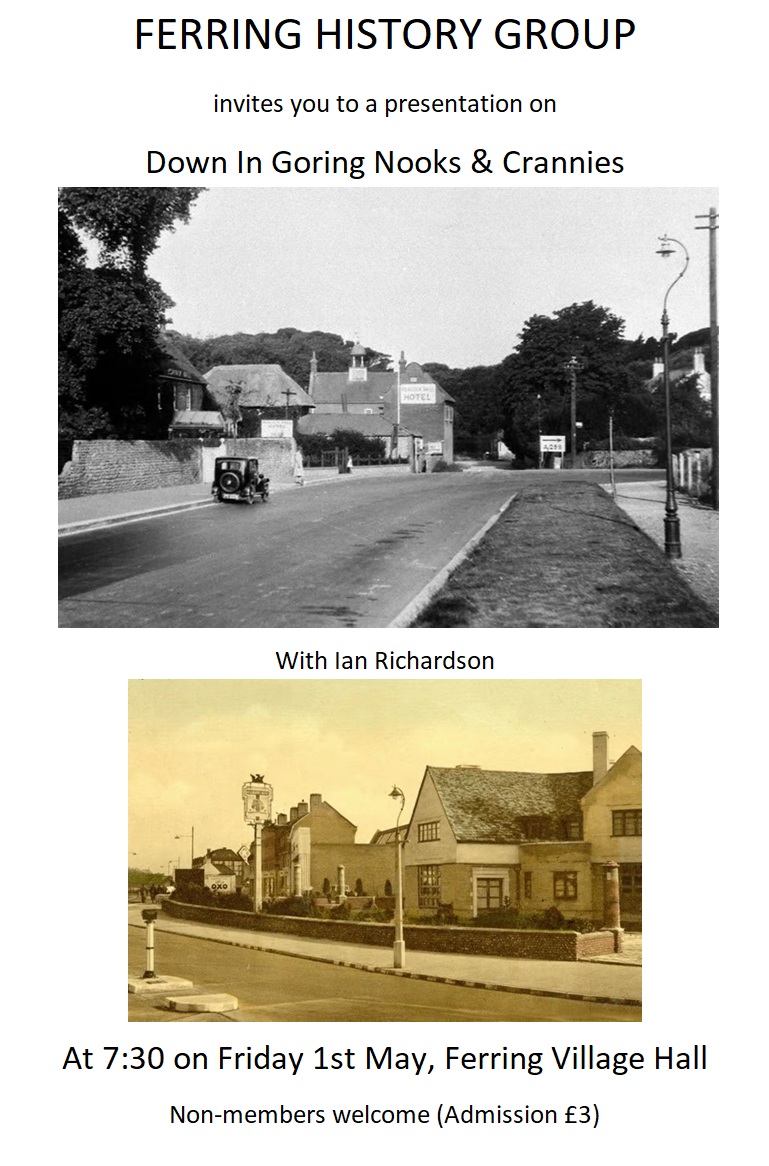 Saturday 16th November – Ferring Village Hall Centenary Day. Ferring Village Hall was officially opened by Georgiana Henty on Friday 14th November 1924. We intend to celebrate the centenary of this event on Saturday 16th November. At 10:30, there will be two talks by Simon Cornish. The first will be a talk on the early history of Ferring Village Hall, and after an interval (coffee, tea and biscuits available) there will be a repeat of the Ferring From The Air presentation, charting the development of Ferring since the 1920’s using aerial photography. There is no charge for this – simply turn up.